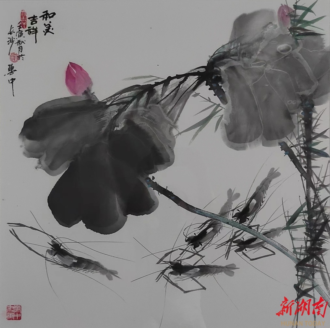 为表现虾的真实形态,万中先生通过多年的实践,调制出与虾接近的色调,呈现了虾的真实感,墨分七色,清淡典雅,富贵舒适,在简略的笔法中显得晶莹剔透,质壳明显,湿润清晰,给人以感观温和清新的画面。