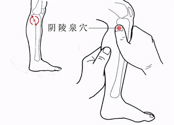 阴陵泉穴在胫骨内侧髁下缘凹陷处,是足太阴脾经的合穴。“合主逆气而泄”,该穴是祛湿要穴,可用来治疗肠腑病症。主治腹痛、腹胀、泄泻;痛经、小便不利、遗尿;水肿;腰膝肿痛。