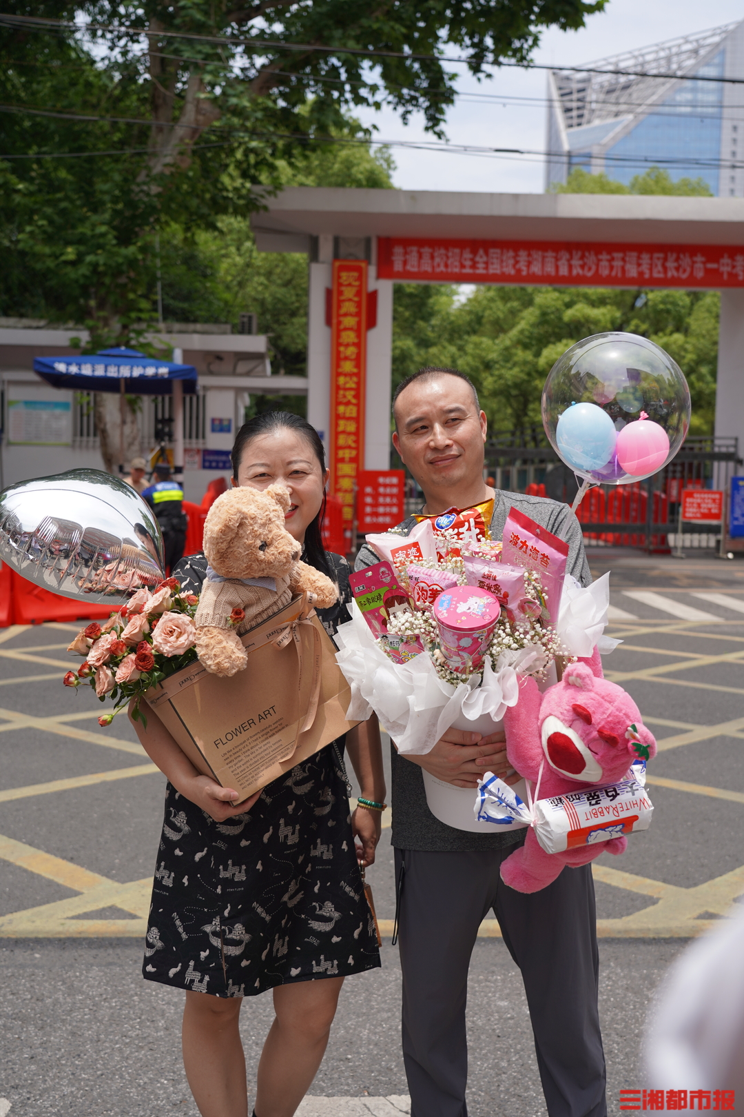 6月9日11时55分,长沙市一中考点,家长们已经抱着花束等候孩子们出考场。一名二孩爸爸开心地喊出:“希望两年后再来一中打卡!”(全媒体记者 王智芳 顾荣 剪辑 刘文)