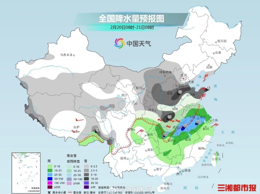 三湘都市报2月20日讯(全媒体见习记者 李致远)2月20日,据中央气象台消息,今起至23日,湖北又将遭遇冻雨,从12小时降水落区来看,冻雨范围很大。受寒潮影响,今明两天(2月20日至21日),中东部雨雪进入最强时段,华北、黄淮等地部分地区将遭遇暴雪,江南等地部分地区有暴雨。
