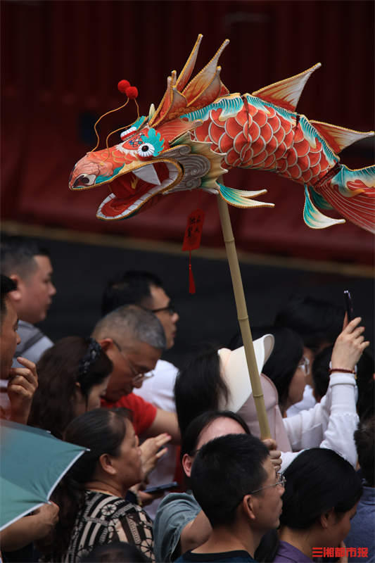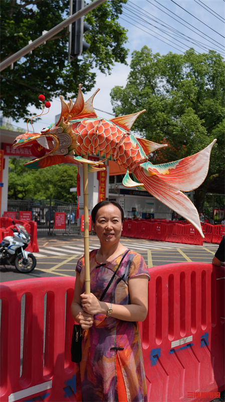 精美的龙鳞、绚烂的颜色、生动的云纹……这一栩栩如生、寓意吉祥的鱼龙灯仿佛要从手中跃然而出,成为考点外一道靓丽的风景线。
