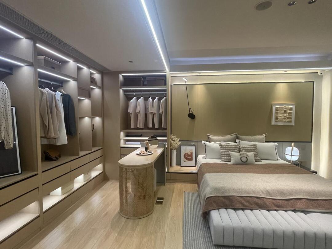 高层住宅“6”字头起,复式洋房“8”字头起,双国企品牌加持,实景现房,即买即装修。长房越秀·星悦荟130㎡的复式洋房样板间,是三房两厅两卫的设计;套内得房约156㎡,得房率高。进门玄关左手边有一排柜子,方便收纳;右侧餐厅连接北向阳台和一个U型大厨房,再往里走是超大横厅,连接南向大阳台。一楼公共卫浴的旁边设计有两间次卧,北向都带有飘窗,便于自然采光和通风。