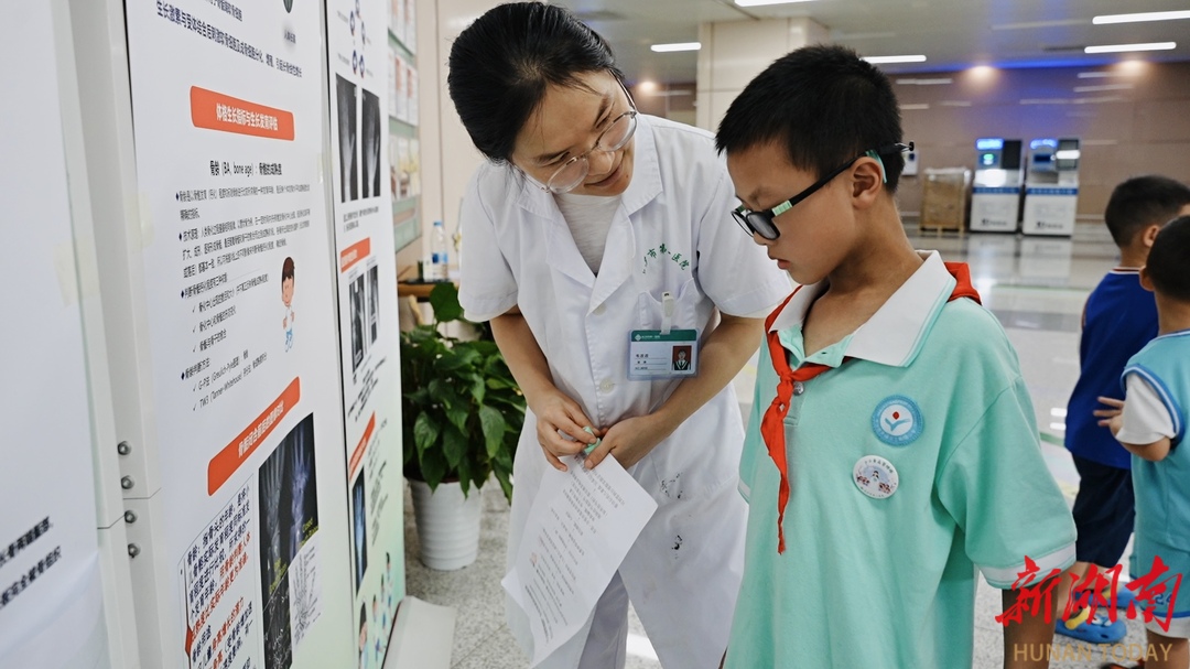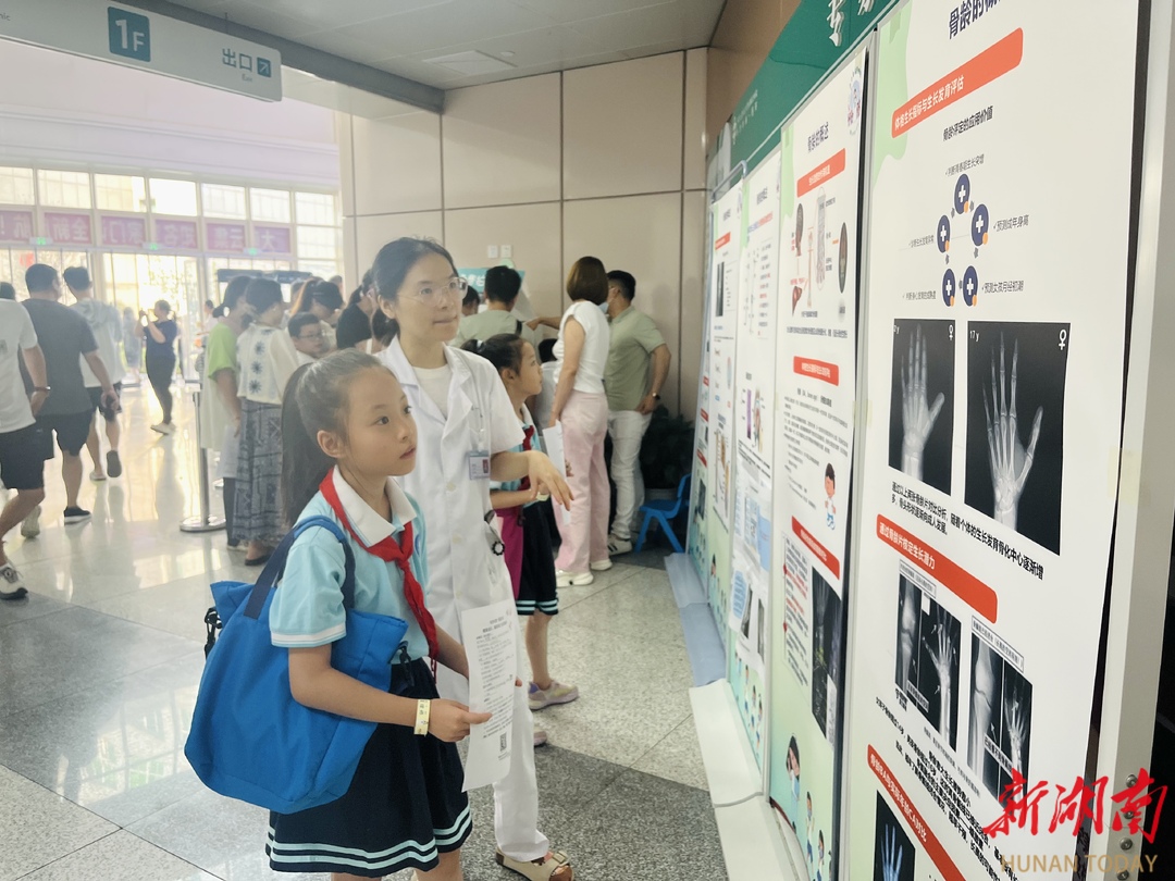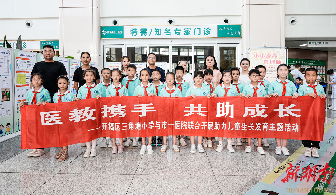 8月10日上午,在长沙市第一医院6号楼一楼大厅里,来自长沙市开福区三角塘小学的学生们井然有序地排着长队,等待进行骨龄测量。当天,长沙市第一医院与长沙市开福区三角塘小学签订“医教协同”协议,为学生免费提供“小小身高管理师”健康义诊活动,吸引了80余名师生及家长参与。