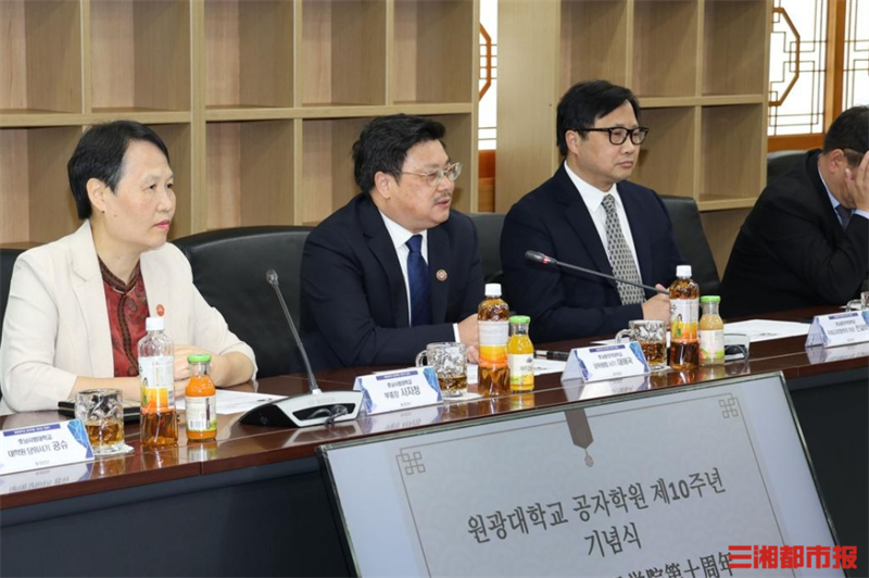 戴爱国与圆光大学校长朴圣泰、湖南师范大学副校长谢资清,共同回顾了孔子学院成立十年来在三校的通力合作下取得的重要成果,并对孔子学院未来建设和发展进行展望。