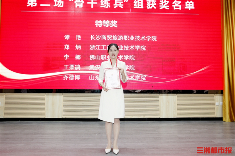 湖南日报9月25日讯(通讯员 龚勋 全媒体记者 刘镇东)近日,2024年全国高职高专院校思想政治理论课第二场“萌新磨课、骨干练兵”现场展示在陕西举行,长沙商贸旅游职业技术学院马克思主义学院教师谭艳荣获“骨干练兵”组全国特等奖第一名,是湖南省唯一获此荣誉的高职院校。