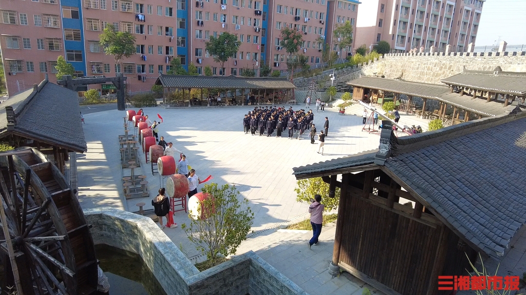 边城茶峒景区内,花垣县第三中学被少数民族特色建筑包围着,学校的舞龙舞狮队员正在训练。(记者 叶竹 摄)