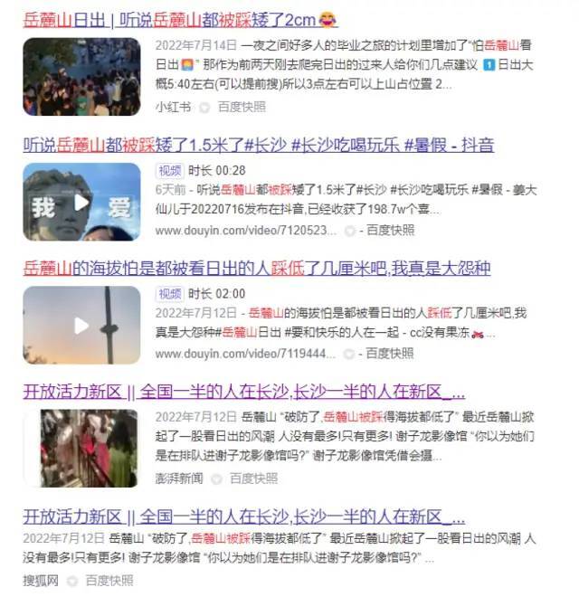 有网友戏称“岳麓山都被游客踩矮了”、“听说岳麓山都被踩矮了2cm”等。