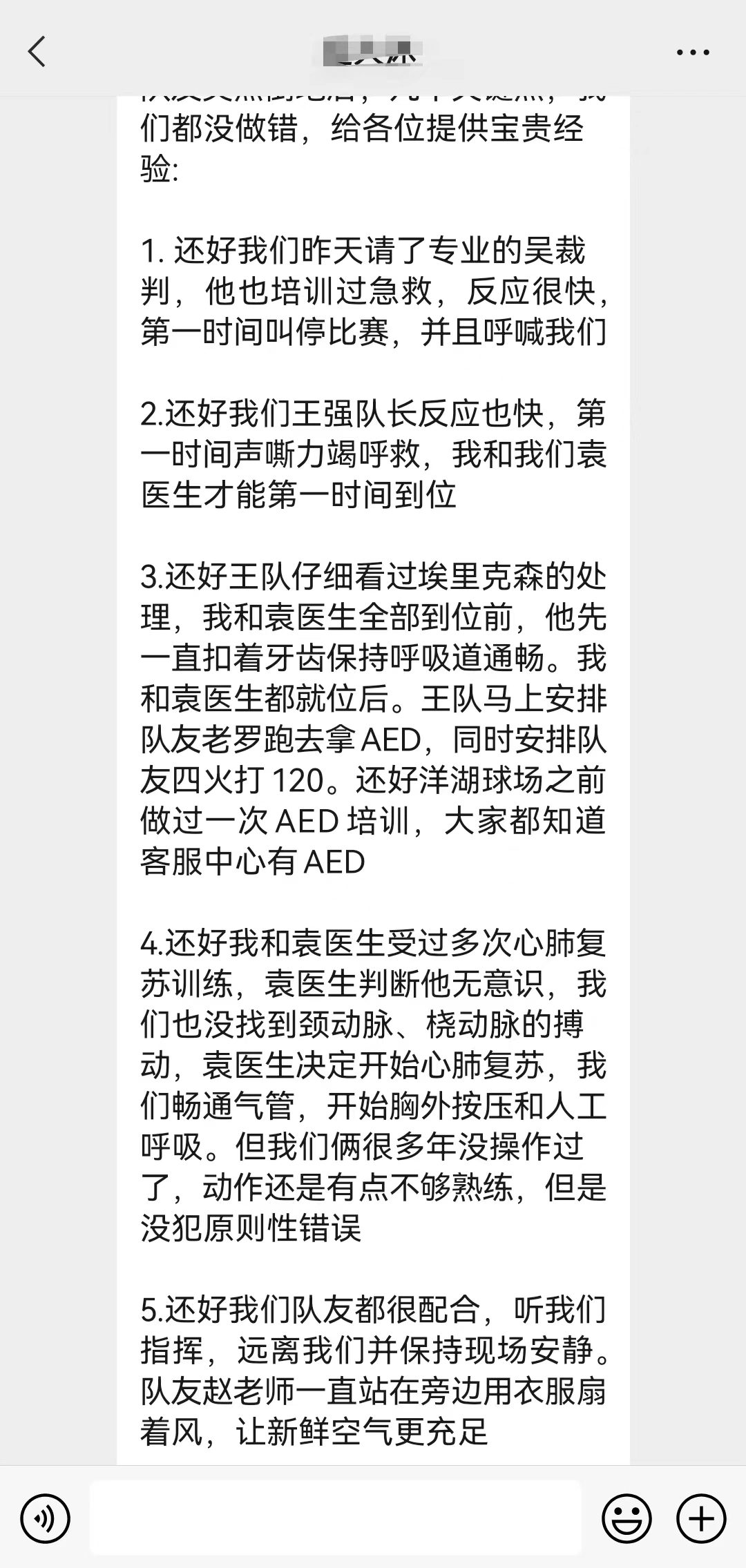 现场队员们后来复盘这一救援过程,愈发觉得与埃里克森当时被救的情形非常相似,不同的是,埃里克森所在的世界顶级赛事现场,有最专业的医疗保障,而他们则是一支业余球队。这次成功救援也有很多因素的叠加,比如现场裁判和队长第一时间意识到事态严重,并立即叫停比赛组织救援工作,现场刚好有具备有医学背景的队员在场和专业医生“外援”,另一个不能忽视的重点是,足球公园配备了AED,AED及时入场。