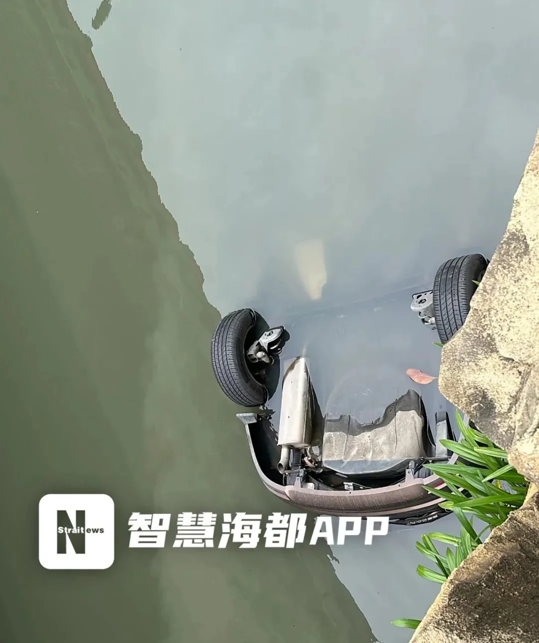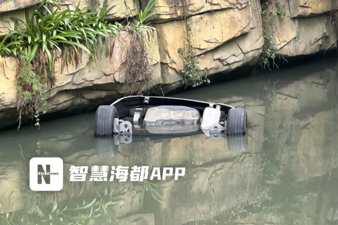 一辆轿车沉在流花溪里 图/记者现场拍摄