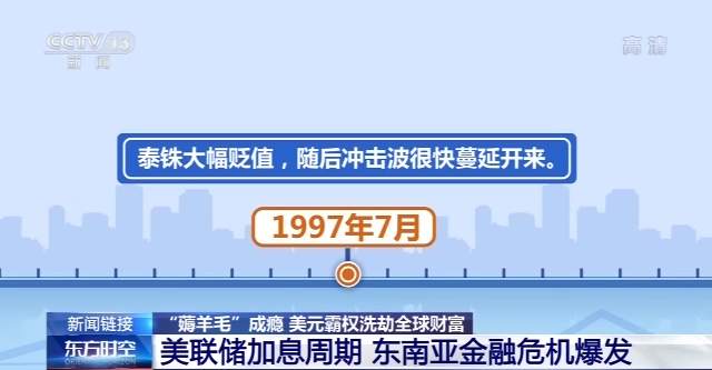 美国在自家“后花园”拉美地区成功“薅”了一拨“羊毛”后,又将目光投向亚洲。20世纪90年代初,东南亚地区经济繁荣发展,在美联储操纵下,大量融资流入东南亚,多国出现经济过热的现象。随后在1994到1995年间,美联储在13个月的时间里接连七次加息。强势美元使大量资本回流美国,成为触发1997到1998年东南亚金融危机的一个关键因素。1997年7月,泰铢大幅贬值,随后冲击波很快蔓延开来,东南亚国家付出了惨痛的代价才从此次动荡中恢复过来。
