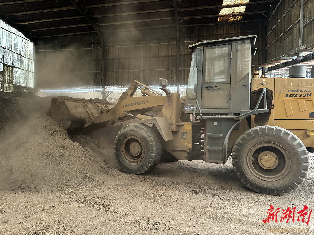 (富立来生物科技有限公司内,铲车正在将打碎的秸秆和畜禽粪便进行混合搅拌。贺顺 摄)