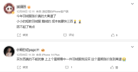 “月薪2万元都舍不得”“去年300元能买到的一款羽绒服,今年双十一打完折要花428元”“前年买的羽绒服现在涨价3倍”......