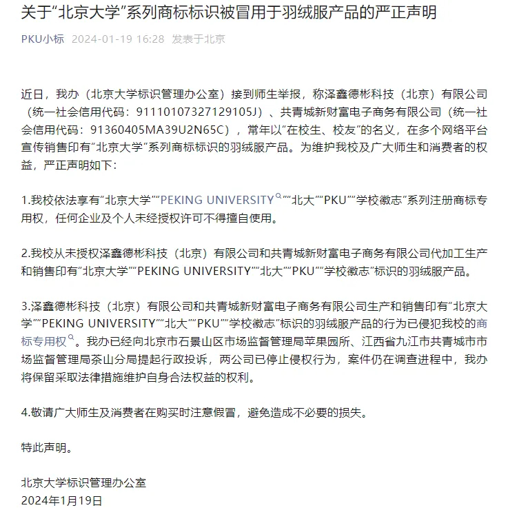 不过,需要提醒的是,高校羽绒服走俏,各种仿冒、代购产品也层出不穷。今年初,北京大学就曾发声明:两公司在多个网络平台宣传销售印有“北京大学”系列商标标识的羽绒服产品,学校已提起行政投诉。