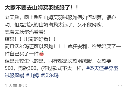 思路打开之后,还有网友去沃尔玛买羽绒服,“出奇地好看, 而且沃尔玛还可以网购”“女款500,男款300”。