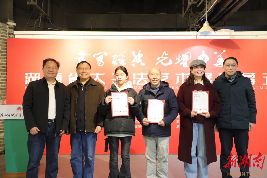 湖南省政协原副主席武吉海宣布展览开幕。 开幕式上,湖南省硬笔书法家协会监事会主席林广大宣读《书写经典 光耀中华——湖南省大书法艺术展获奖、入展、入选结果的通报》。颁奖嘉宾为大书法艺术展的获奖和入展作者代表颁发了荣誉证书。刘亚兰作为获奖代表作了获奖感言。