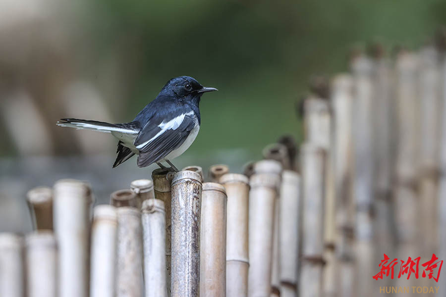 2月21日,长沙市岳麓山,鹊鸲站立在竹篱笆上。鹊鸲活泼好动,觅食时常摆尾,高兴时会发出婉转多变的鸣叫,有“四喜儿”之称。鹊鸲出没于村落和人家附近的园圃,栽培地带或树旁灌丛,也常见于城市庭园中。食物以昆虫为主,也吃少量草籽和野果。 湖南日报全媒体记者 张京明 摄