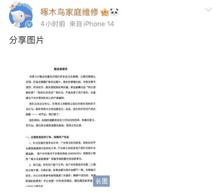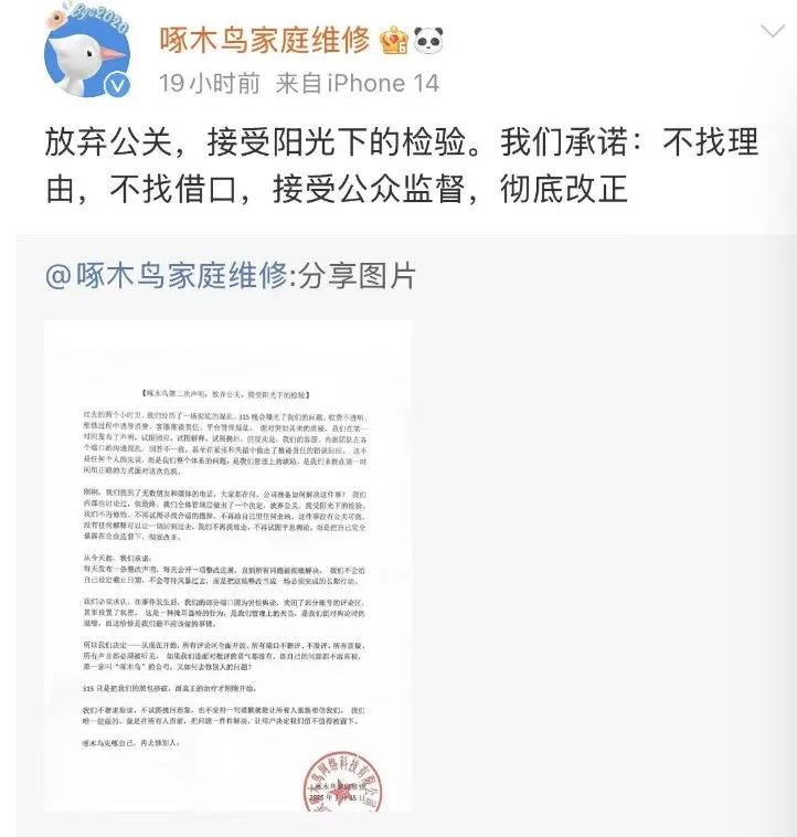 昨天(3月16日)晚上,@啄木鸟家庭维修 再次道歉,发布《整改承诺书》:“对不起,我们错了!”