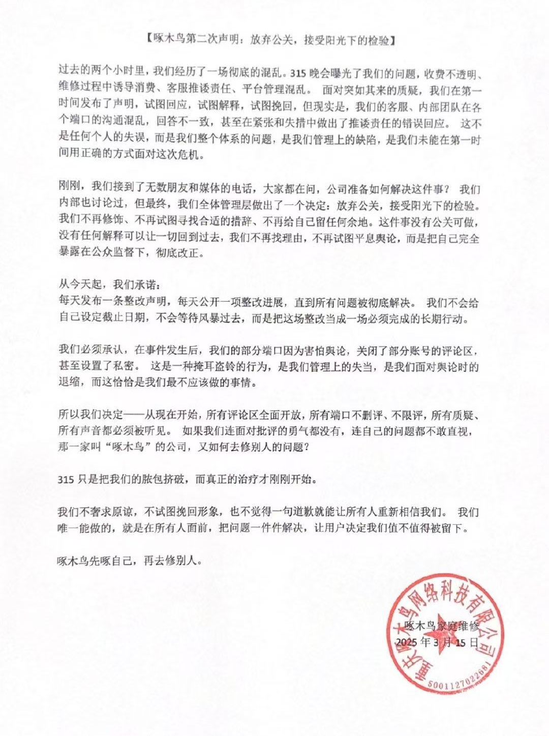 15日深夜,啄木鸟家庭维修平台再次道歉,称放弃公关,不再试图平息舆论,彻底改正。