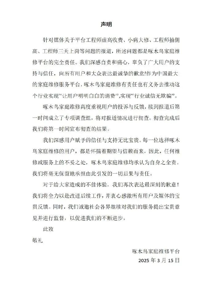 针对媒体报道的内容,啄木鸟家庭维修平台3月15日晚发布第一份道歉声明: