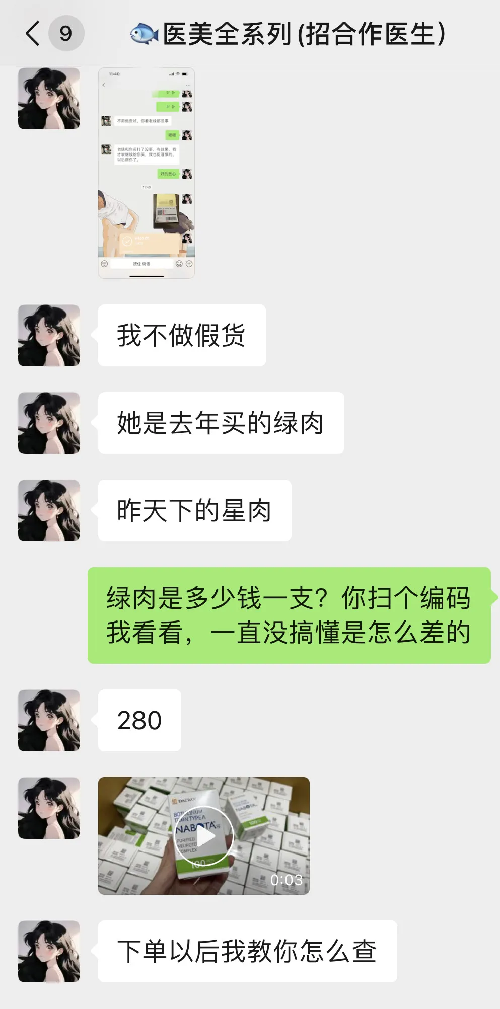“这个绿(肉)是假货最多的,十个有七个假。”欣欣向新京报记者担保,她的货源可靠保真,是从上一级代理那里100支起订,以200元一支的价格购入,“是从韩国运来的。”她也不知道“绿肉”的出厂价是多少,一直在寻找更便宜的正品货源。