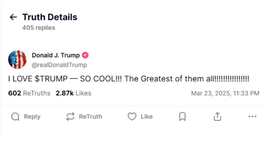 3月23日深夜,美国总统特朗普突然发帖文,内容称:“我爱特朗普币,太酷了!他们中最棒的!!!!!!!!!”