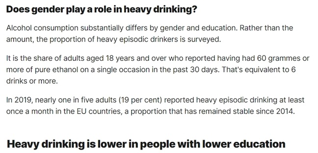 调查显示,在所有欧盟国家中,男性比女性更有可能出现重度“间歇性饮酒”问题;此外,受教育程度较低的人群反而不容易出现重度“间歇性饮酒”者,这是由于“受教育程度高、收入高的人更能负担得起相关消费”。