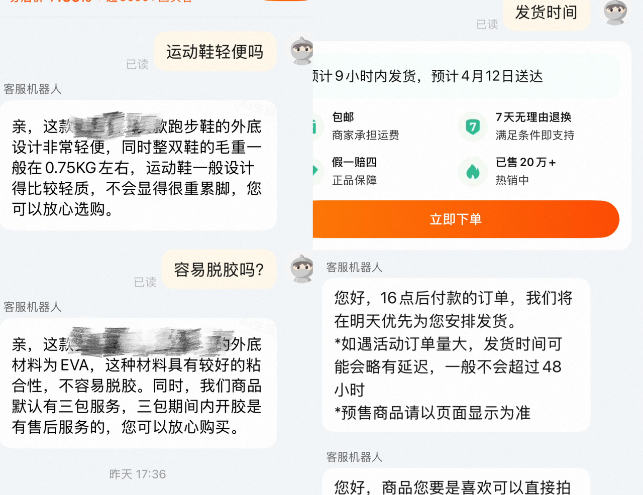 9日,潮新闻在某运动品牌线上旗舰店,将一款运动鞋链接发给客服,并询问“运动鞋轻便吗”“容易脱胶吗”“发货时间”等问题,对方均以AI客服作答,且回答内容较为精准。