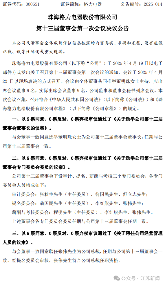 4月22日,格力电器临时股东大会审议通过了公司董事会换届选举的议案,董明珠顺利当选新一届董事,并再次当选格力电器董事长,开启她执掌格力电器的第五个三年任期。值得关注的是,她没有再担任格力电器的总裁。