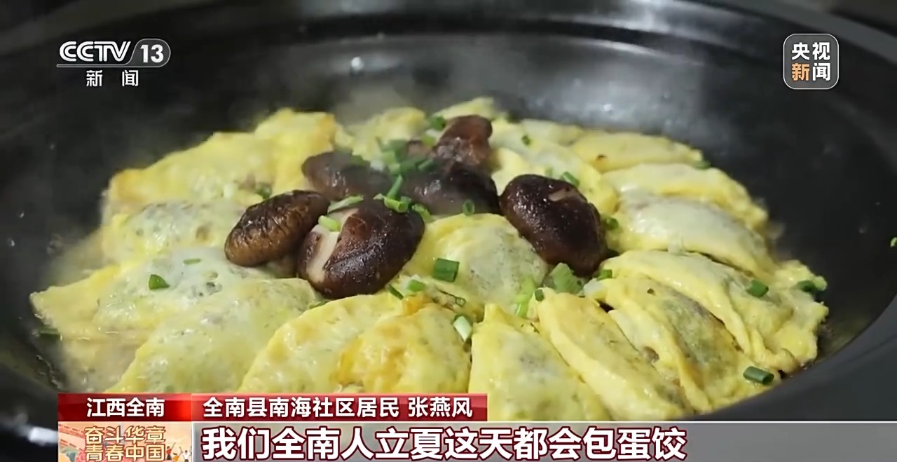 全南县南海社区居民 张燕风:我们全南人立夏这天都会包蛋饺,孩子们也都喜欢吃。蛋饺有团团圆圆、幸福美满之意。