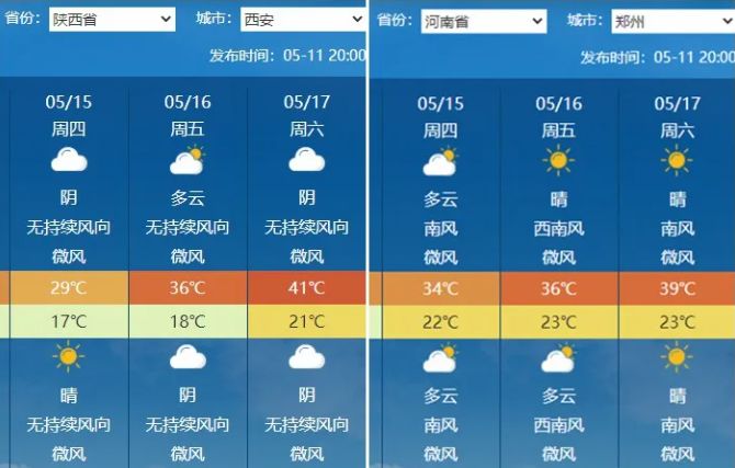 5月17日,西安最高气温将达41℃、郑州将达39℃。图源:中国天气网