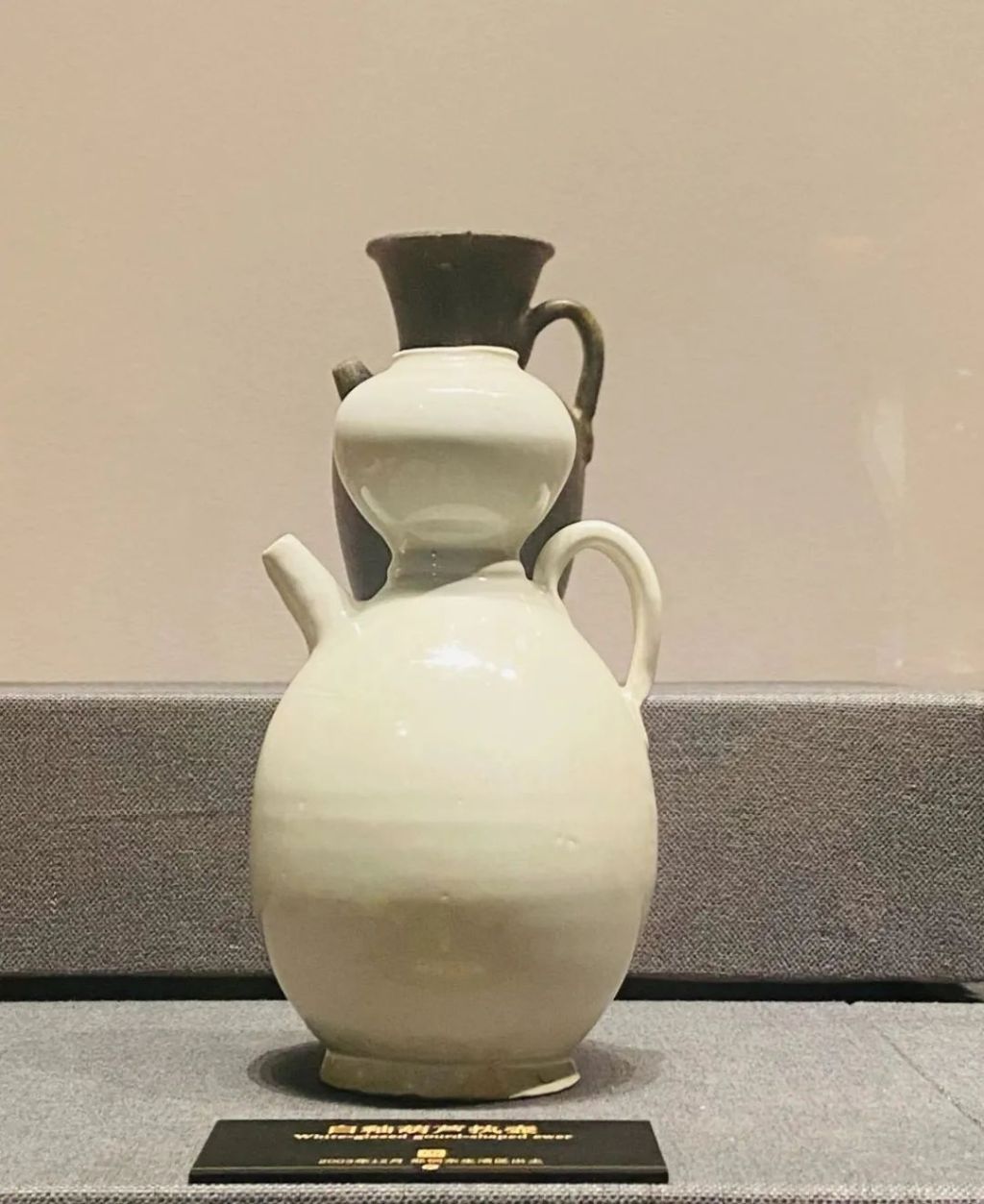 郑平安手里的葫芦形酒壶也有原型,河北邢台博物馆和定州博物馆都有类似器物。邢台博物馆所藏唐白釉葫芦执壶朴素无装饰,是唐代器物,定州博物馆的酒壶刻了花纹,应是宋代器物,沿用了唐代器型。