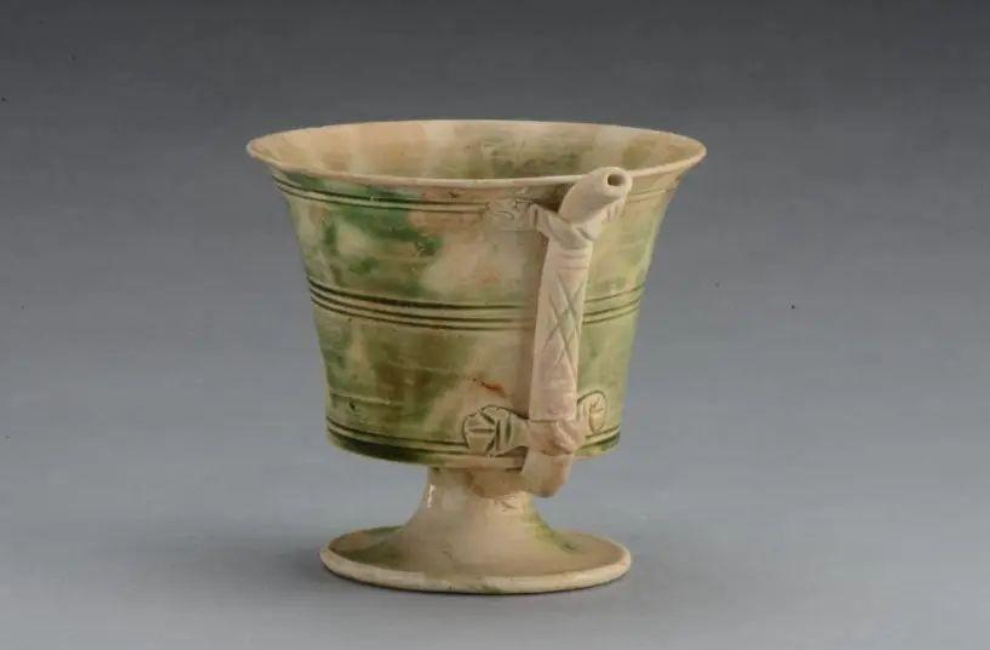 郑平安手上拿的杯子,原型是唐代的吸管杯,杯子造型别致,沿杯壁附有一根可以出水的吸管。黑石号沉船上曾有这种杯子出水,收藏在新加坡亚洲文明博物馆,2020年曾回上海展出。国内在河南巩义等地也曾出土过吸管杯。