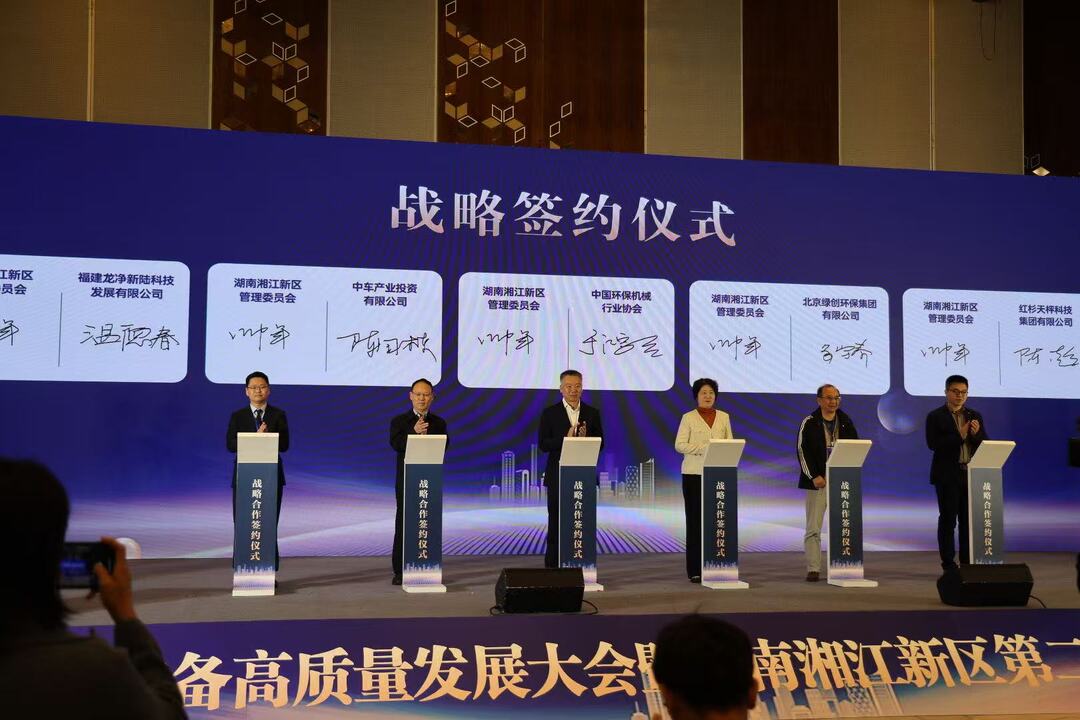 开幕式现场,中国光大环境(集团)有限公司等10家行业龙头企业共同发起成立“固废产业链创新联盟”,凝聚“产学研用资政”多方力量,构建固废全产业链高质量发展新生态。同时,中国环保机械行业协会、中车产业投资有限公司、北京绿创环保集团有限公司、福建龙净新陆科技发展有限公司、红杉天枰科技集团有限公司5家单位与湘江新区签订战略合作协议,将在技术研发、市场推广、项目落地等方面深化合作。