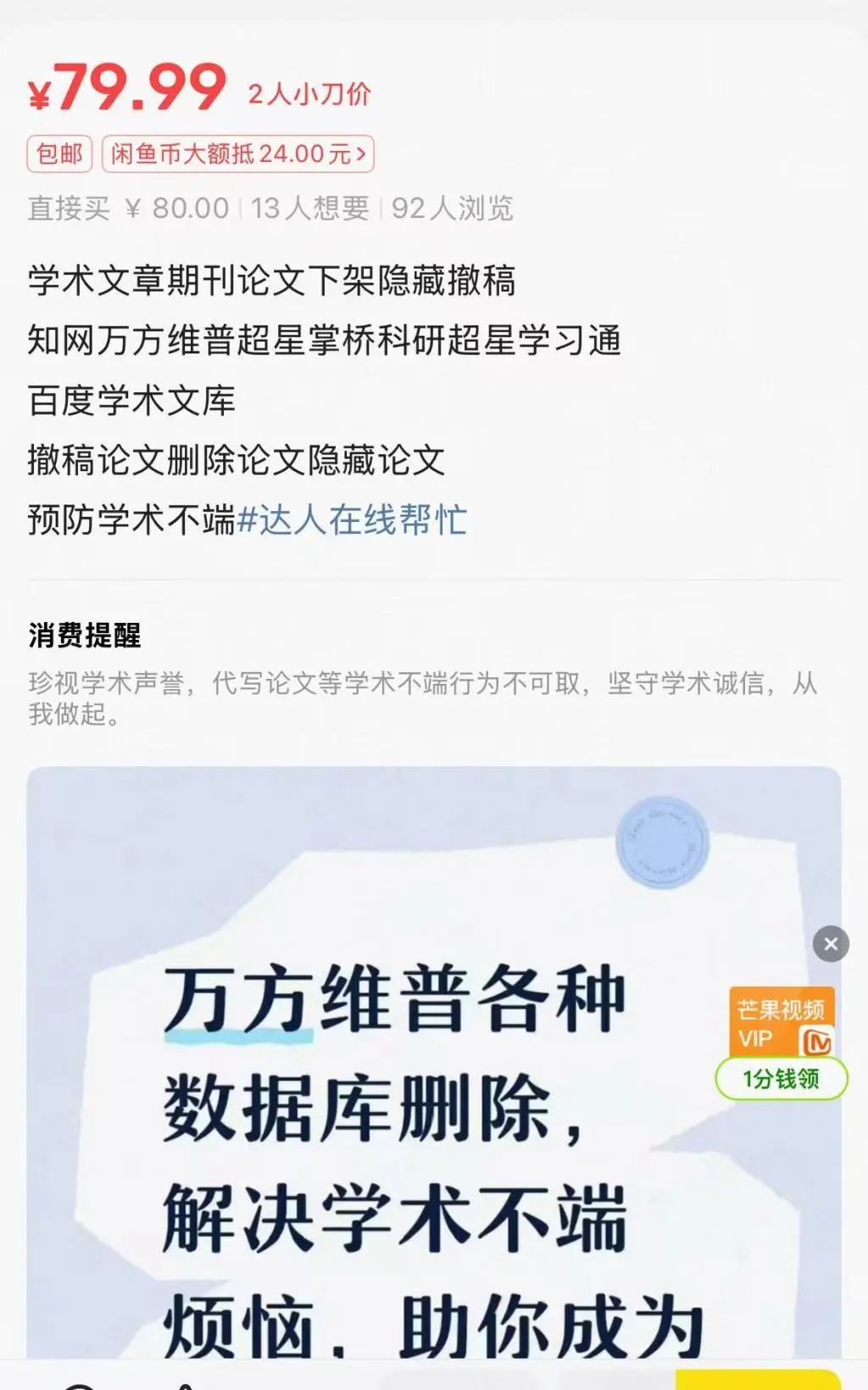 这些中介声称,可以在知网、万方、维普、百度学术文库等平台“无痕撤稿”,直接下架、隐藏客户在相关平台的学术文章。推销业务时,他们常见的话术包括“学术不端就是给自己埋雷”、“预防被人举报”等。