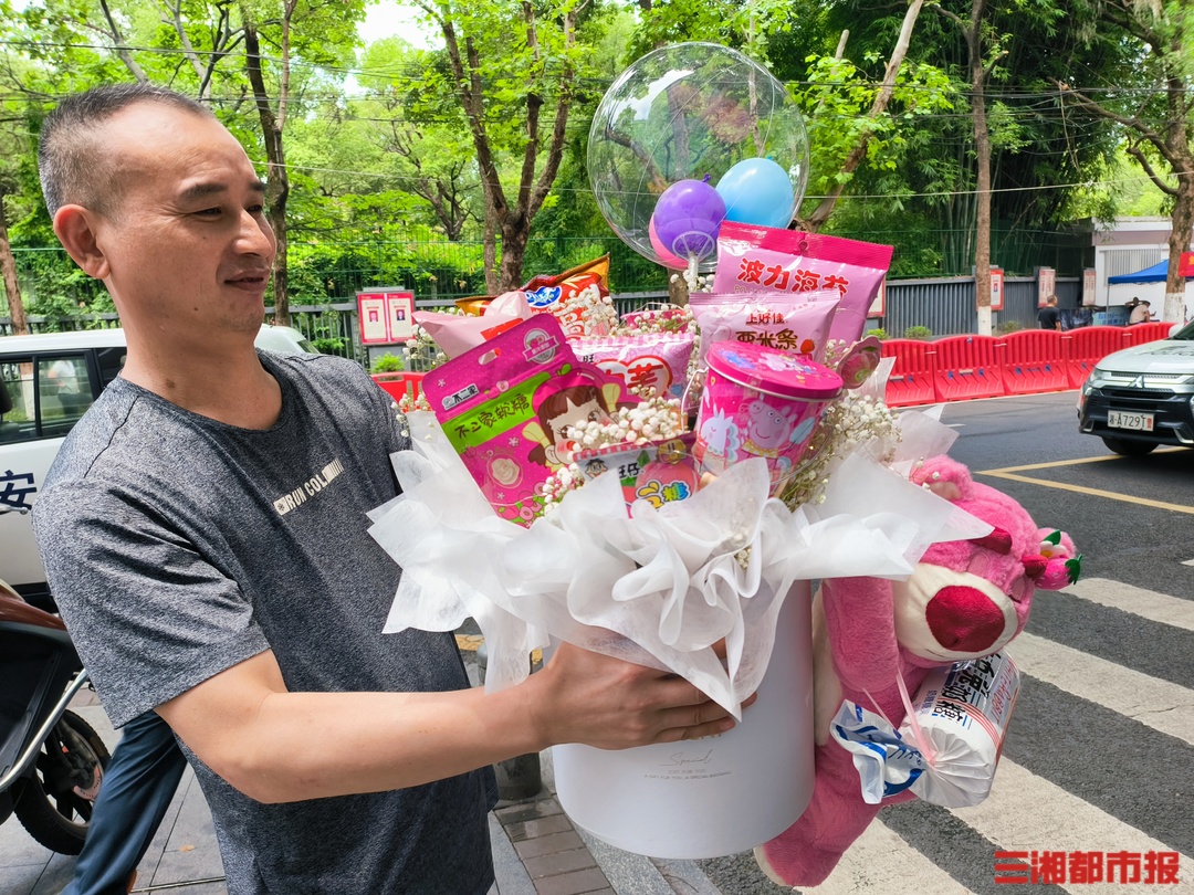 冲出校门,爸爸妈妈送上鲜花和拥抱