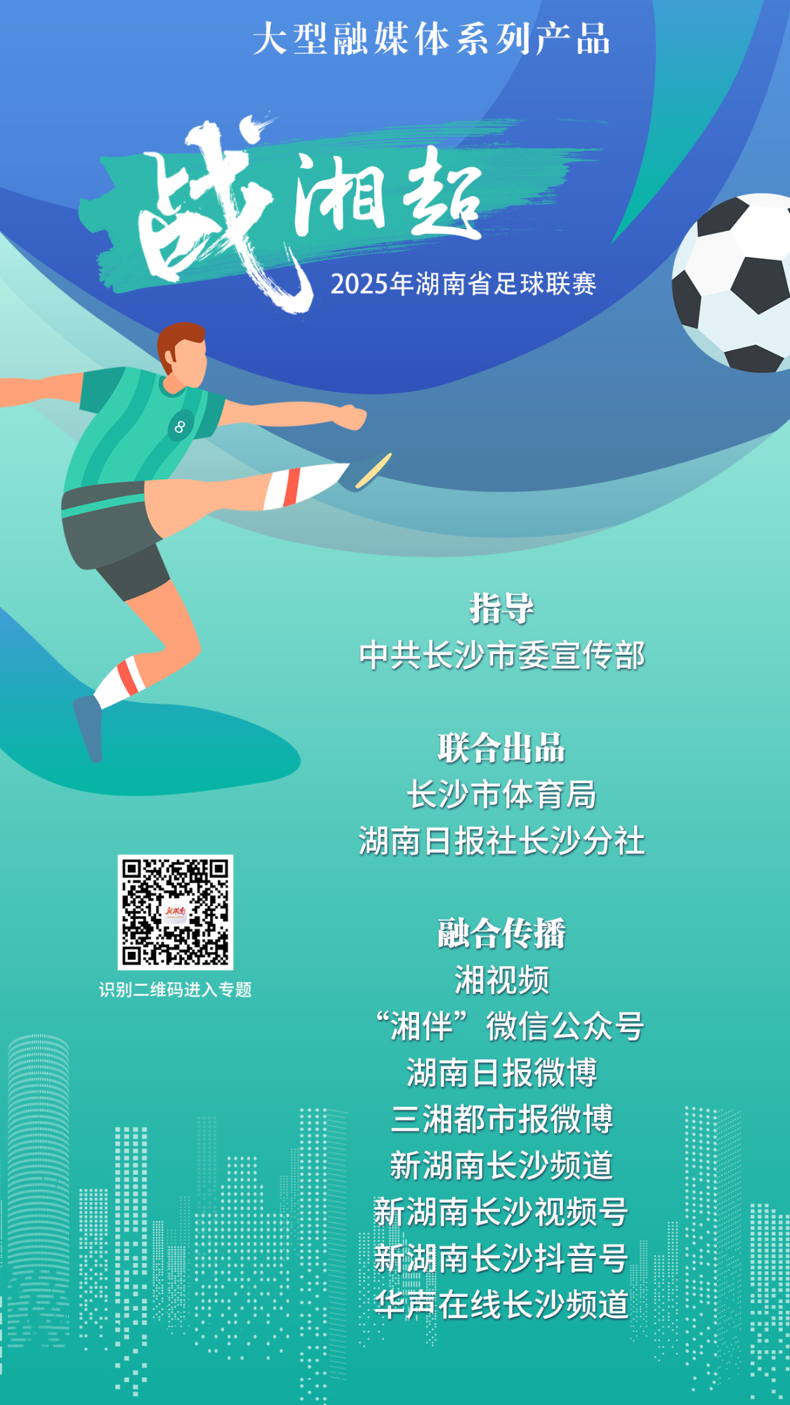 2025年湖南省足球联赛(湘超)来了!中共长沙市委宣传部指导,长沙市体育局、湖南日报社长沙分社联合推出《战湘超》融媒系列报道,彰显长沙拼搏进取、团结协作、勇攀高峰的胸怀格局,让赛事流量沉淀为驱动城市发展的持久动能,为体育强国、健康中国建设贡献更多长沙力量。敬请关注!