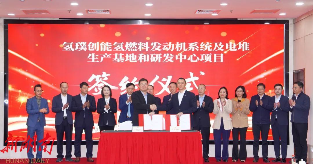 湖南日报·新湖南客户端3月29日讯(通讯员 李先强 李艺超 彭凤)3月26日,氢璞创能项目签约仪式在长沙举行。该项目拟在宁乡高新区投资建设氢燃料发动机系统及电堆生产基地和研发中心,投资总额约10亿元,产能规划1万台。长沙市副市长彭涛,宁乡市委副书记、市长黄滔,宁乡市(区)领导宋强、王君、苏继桃、陈鑫出席。