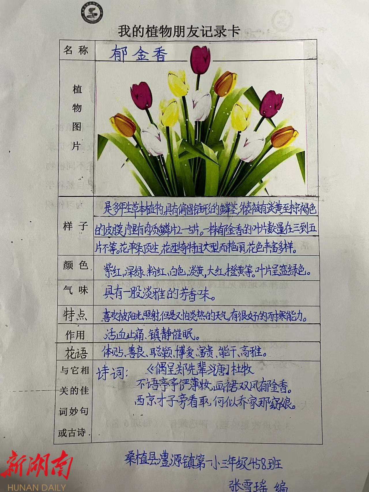 湖南日报·新湖南客户端3月25日讯(通讯员 覃珊珊 王明霞)为了让学生掌握观察方法,亲近植物,了解植物,和植物做朋友,3月25日,澧源镇第一小学组织三年级学生开展了一次有趣的实践活动——制作植物观察记录卡,和自己喜欢的植物来了一次烂漫的约会。