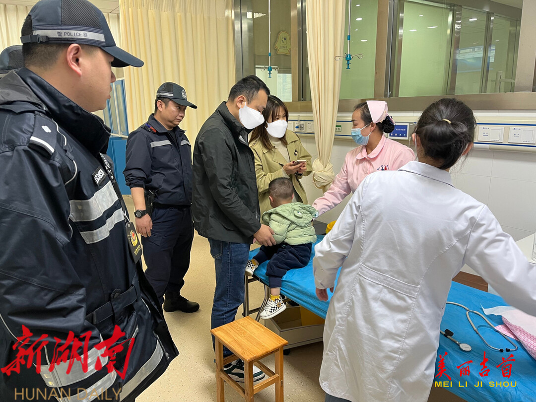 “时间紧急,请跟着我们走!”近日,一对长沙夫妇带着两岁的儿子自驾游来到湘西芙蓉镇游玩,准备返程时,突然发现儿子将电蚊香液当做零食吞食,情况十分危急。为了不耽误医治时间,男童父亲拨打报警电话向吉首市公安局请求帮助,吉首市公安局指挥中心立即派出警力,交巡警四中队很快与家属取得联系汇合,上演了一场生死时速,为男童开辟“生命通道”。