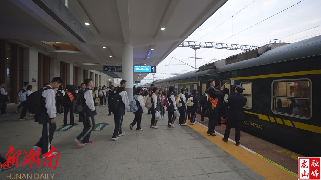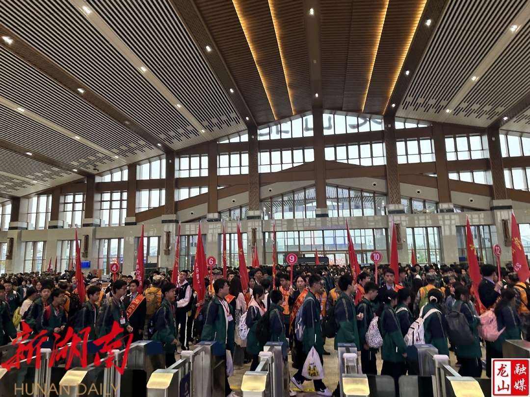 在龙山北站候车大厅,来自全县1900余名的学子排列整齐,伴随着期待和兴奋,即将开启他们的研学之旅。龙山北站工作人员和怀化铁路公安处龙山北站派出所民警在进站口、安检口、候车室、站台等重点场所引导学生们安全候车、平安乘车,为研学专列保驾护航。早上7点05分、8点05分Y831次、Y833次两趟龙山北至韶山的“我的韶山行”研学专列驶出龙山北站,1900余名学子走出大山,开启研学之路。