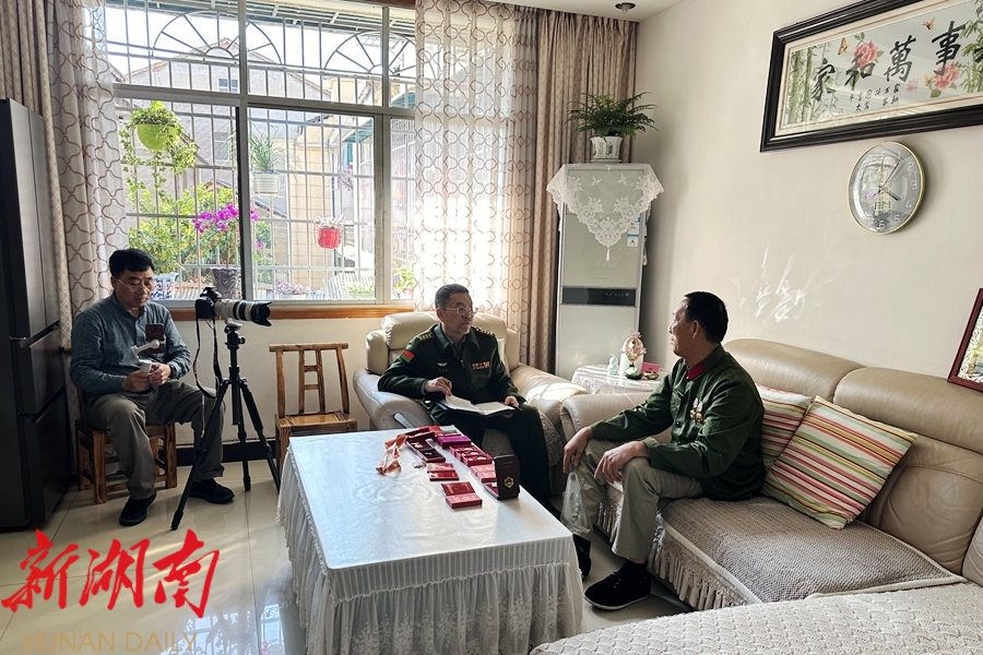 湖南日报·新湖南客户端3月31 日讯(李翔根) 3月31日,中国人民解放军陆军防化学院两名教授来桃源开展老兵口述资料采录、收集与整理工作。在对越自卫反击战老兵罗兴元的家中,工作人员认真聆听老兵讲述战斗故事,同时征集书信、勋章、照片、实物等档案资料。