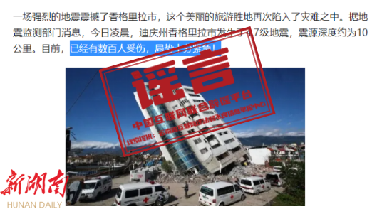 真相: 2024年4月9日22时07分,云南省迪庆藏族自治州香格里拉市发生4.7级地震,有网民发布“大楼倒塌”画面图片,并称“已经有数百人受伤”。对此,“迪庆发布”微信公众号发文回应,目前,暂未收到人员伤亡报告,当地通讯、供电、交通正常。经核实,网传“大楼倒塌”图片也与此次地震并无关联,系部分自媒体为博眼球、蹭流量,运用拼凑网络旧图、旧视频等手段,发布香格里拉地震不实图文、音视频等信息严重误导网民。(来源:云南互联网联合辟谣平台、“迪庆发布”微信公众号)