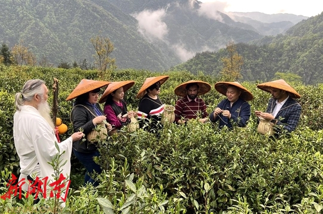 探访期间,国际友人走进大熊山,参观蚩尤屋场,观看梅山傩戏表演,在熊山古寺品尝禅茶,领略梅山文化的独特魅力。在奉嘎山,他们亲手采摘茶叶,体验古法制茶乐趣,与百岁老人和茶艺师品茶论道、参加茶寿宴,深入了解茶叶采摘、制作和品鉴之道。