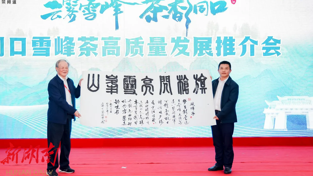 湖南师范大学教授、中国茶文化首席专家、中华茶祖文化理论奠基人蔡镇楚为洞口雪峰茶特别分享了“旗枪闪亮雪峰山”茶文化公益讲座,向洞口赠予字画,为洞口的茶文化赋能,构建出洞口茶文化更加厚重的内核。