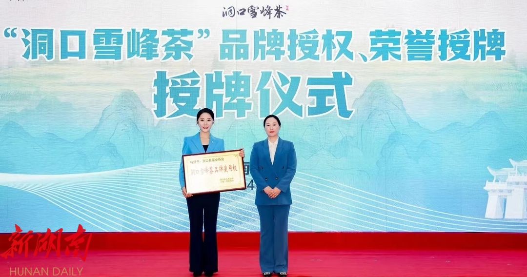 推介会现场,贺永亮介绍了洞口茶产业发展情况和洞口雪峰茶品牌情况,代表县人民政府与湖南科技大学签订了实施“百校联百县兴千村”行动合作框架协议。副县长毛超林代表县人民政府授予县茶业协会洞口雪峰茶公用品牌和包装使用权、管理权。湖南科技大学组织部正处级组织员廖巍代表湖南科技大学授予湖南古楼雪峰云雾茶有限公司“湖南洞口茶叶科技小院”牌匾。湖南盛朋国际贸易公司、邵阳学院、邵阳市烟草专卖局等国有企事业单位和协会、商会、出口民企与洞口县茶业协会、湖南古楼雪峰云雾茶公司等县内茶企现场签定了总金额3600万元的茶叶订单。县内10家银行机构联合对全县86家茶企、种茶大户、文旅产业企业进行了集中授信,总金额达3.91亿元。湖南省茶叶品牌建设促进会副会长兼秘书长尹钟宣读了《关于设立覃小洪等 12 个“茶叶加工 高级专家工作室”的决定》,郭真明、谢商文、侯自芳、萧力争为覃小洪等 12 个“茶叶加工高级专家工作室”授了牌。