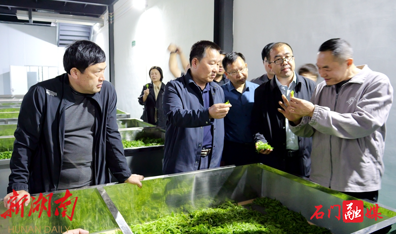 石玉林一行实地前往夹山禅茶院、湖南云中君茶业有限公司和湖南石门渫峰名茶有限公司的茶园基地、加工生产线等地,详细了解我县茶叶产业发展情况,并就“石门茶业有什么”“石门茶叶怎么产,如何销”“茶农增收有多少”“茶旅融合怎么做”“本土茶文化如何传承”等问题进行深入交流。