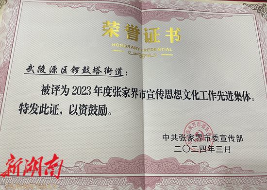 湖南日报·新湖南客户端 4月24日讯(通讯员 李东航)近日,中共张家界市委宣传部印发《关于表彰2023年度全市宣传思想文化工作先进集体和先进个人的决定》。锣鼓塔街道荣获“2023年度张家界市宣传思想文化工作先进集体”荣誉称号。