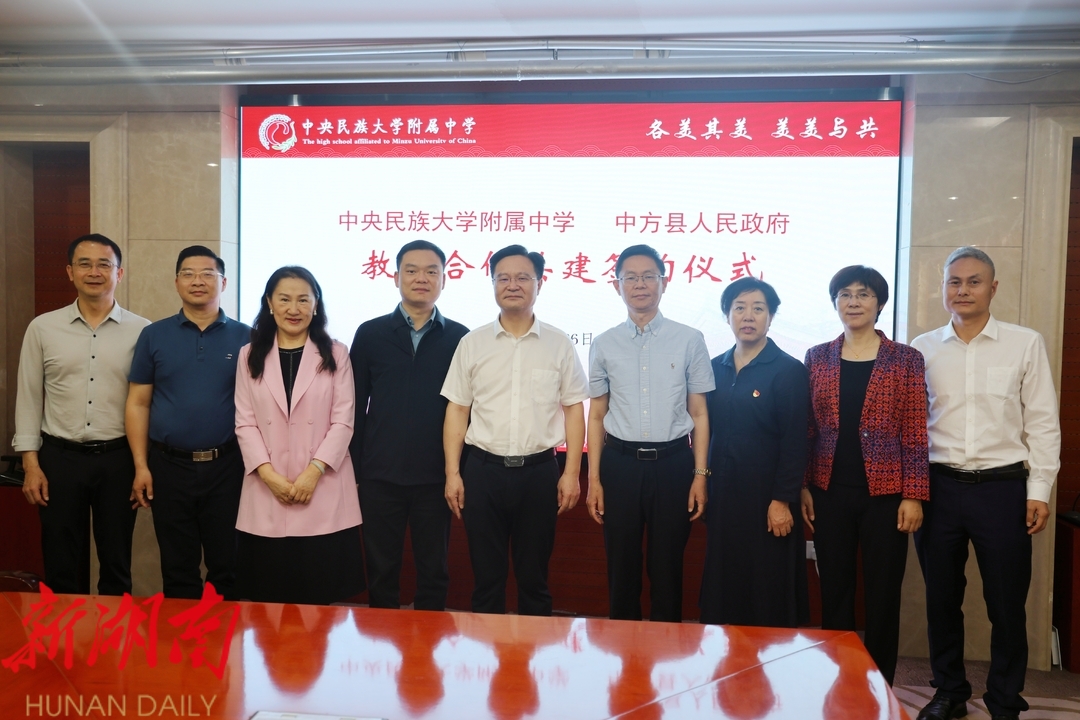 中方融媒4月26日讯 4月26日,中方县与中央民族大学附属中学教育合作共建签约仪式在中央民族大学附属中学第一会议室举行。市委常委、组织部部长李博,中方县委副书记、人民政府县长胡杰,中央民族大学附中教育集团总校校长、民大附中党委副书记、校长唐洪波,中央民族大学附中教育集团总校党委常务副书记佟丽娟,中央民族大学附中校长助理李淑霞、张立波,中方县人民政府副县长杨小华参加签约仪式。