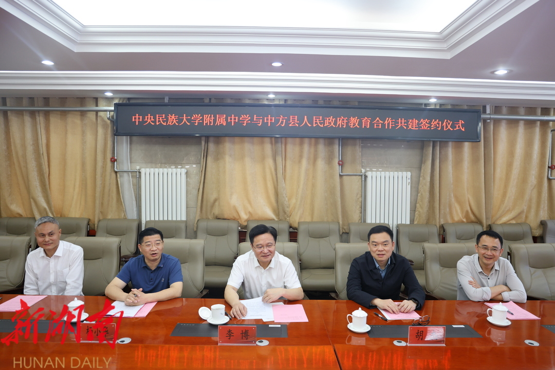 李博对中央民族大学附属中学给予中方县教育事业的倾情帮扶表示最诚挚的感谢。他指出,当前怀化正在全力推进鹤中一体化发展战略,中方县作为鹤中一体化发展的核心引领区,此次教育合作共建协议的签订,是怀化市引进优质教育资源,全力推动建设五省周边中心城市,打造大湘西区域教育中心的重要举措,也充分体现了中央民大附中心系后发地区教育事业、均衡优质教育资源的责任与担当。希望中方县能结合教育发展实际,细化交流合作举措,认真学习借鉴中央民大附中的好理念、好经验、好做法,深化教育教学改革,提高教育教学质量,不断弥补自身不足和短板,着力打造中方教育“样板”,奋力建设全市乃至全省“教育强县”。