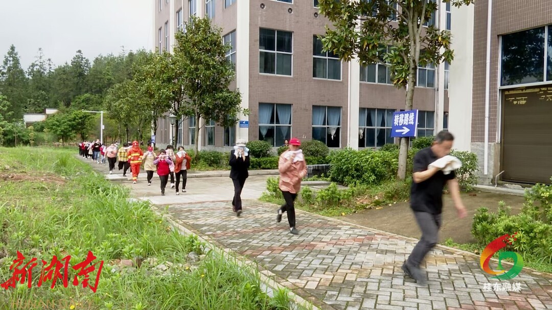 防汛避险转移应急演练环节,随着警报拉响,巡逻人员发现并报告险情,大塘镇立即发布信号、启动预案,巡逻人员敲锣吹哨,通知险情,群众扶老携幼,应急队员背上受伤被困群众,紧跟队伍沿应急转移路线快速转移到安全地带。
